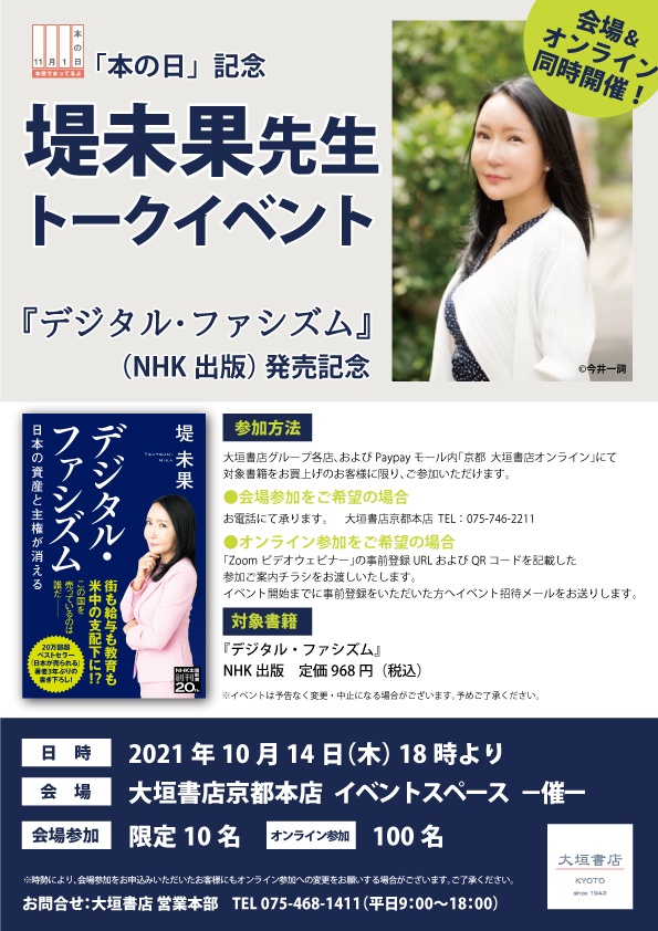 大垣書店京都本店にて、11月1日の「本の日」と『デジタル・ファシズム』(NHK出版)の発売を記念して、トークイベントを会場とオンラインで同時開催します。