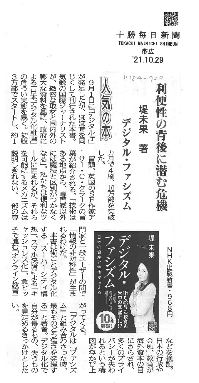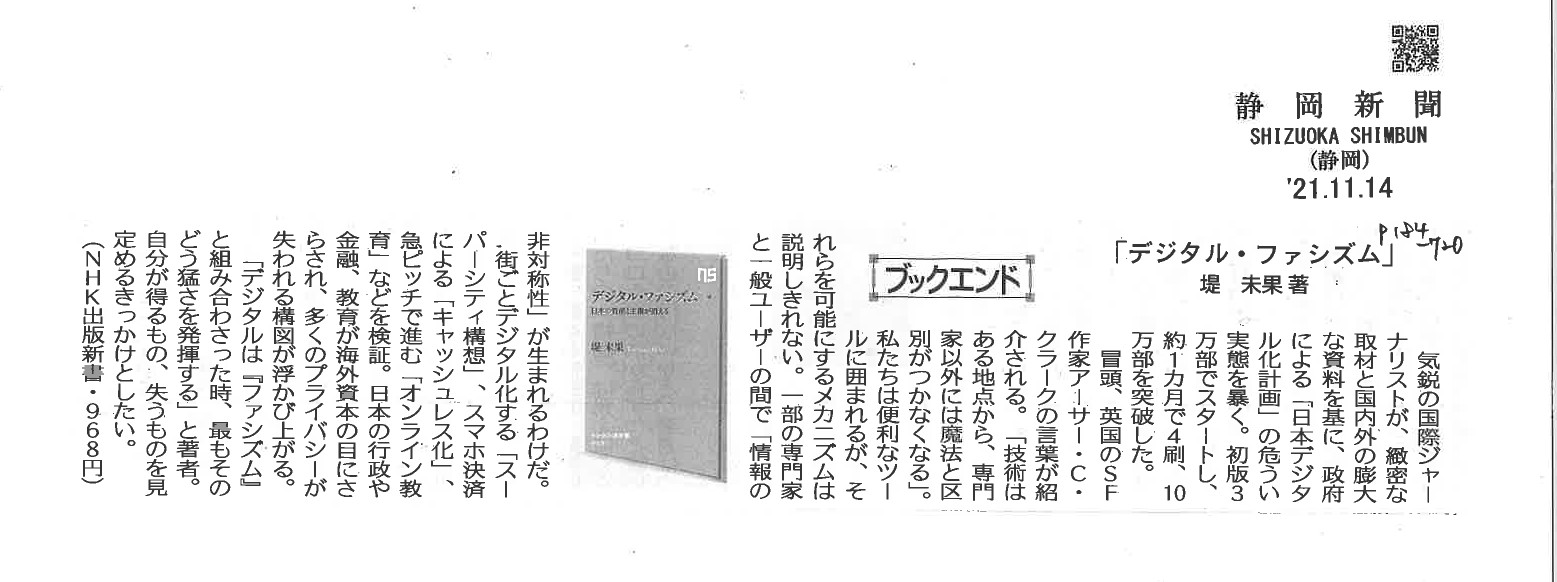 静岡新聞、十勝毎日新聞の本の紹介コーナーで「デジタル・ファシズム」が紹介されました!