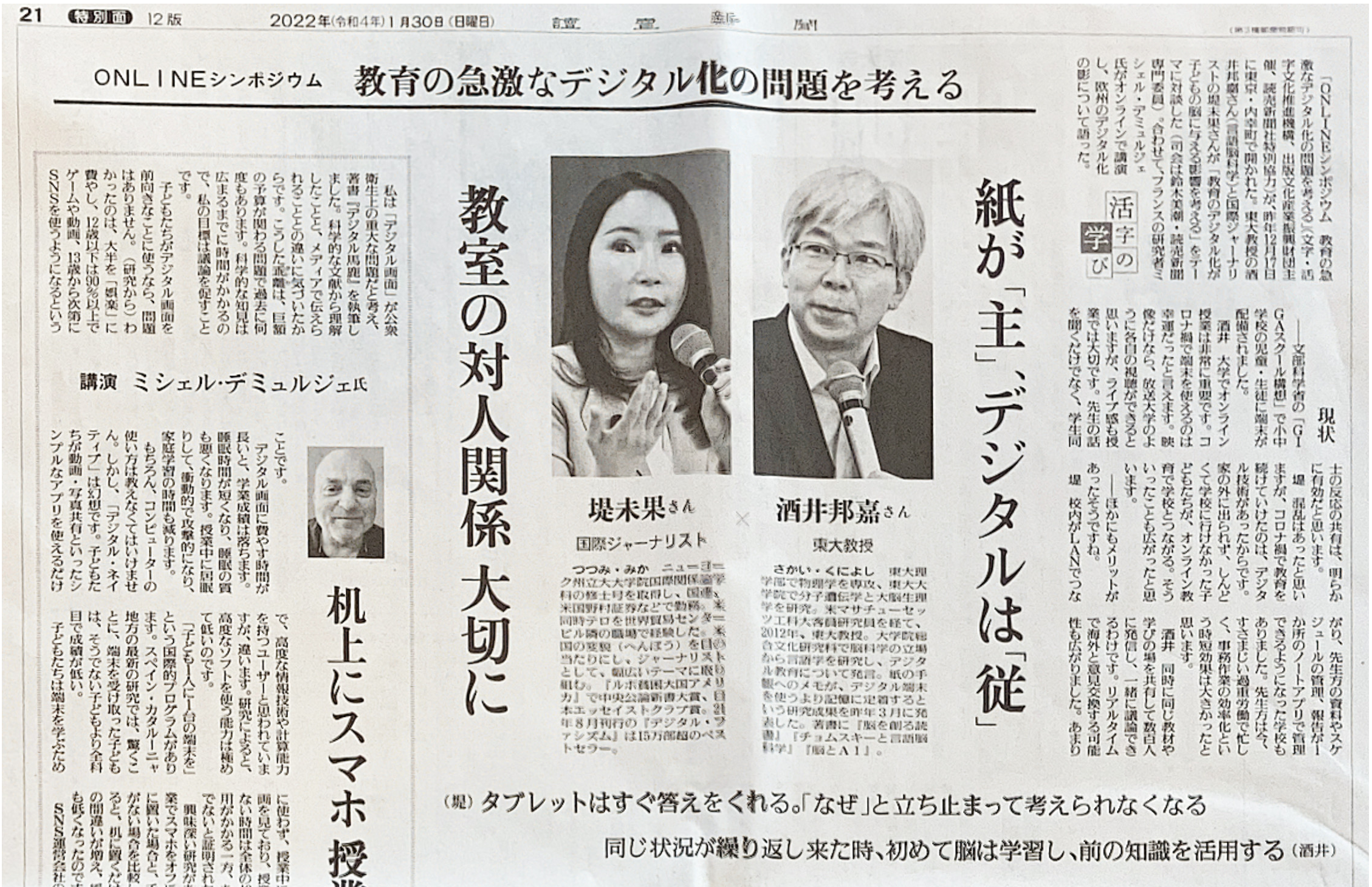 教育のデジタル化について、文字活字推進機構主催で東大の酒井邦喜教授との対談が読売新聞に載りました!