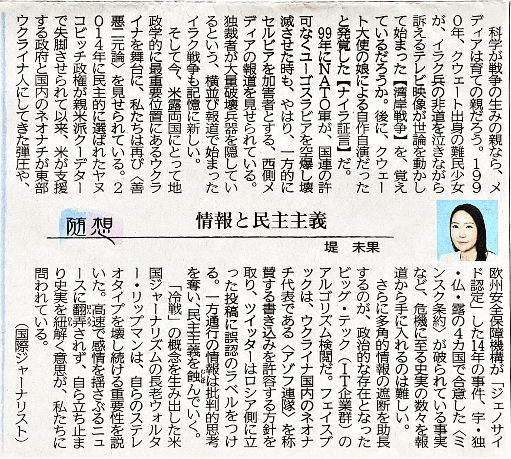 神戸新聞連載「随想」3/18付で情報と民主主義について書きました!