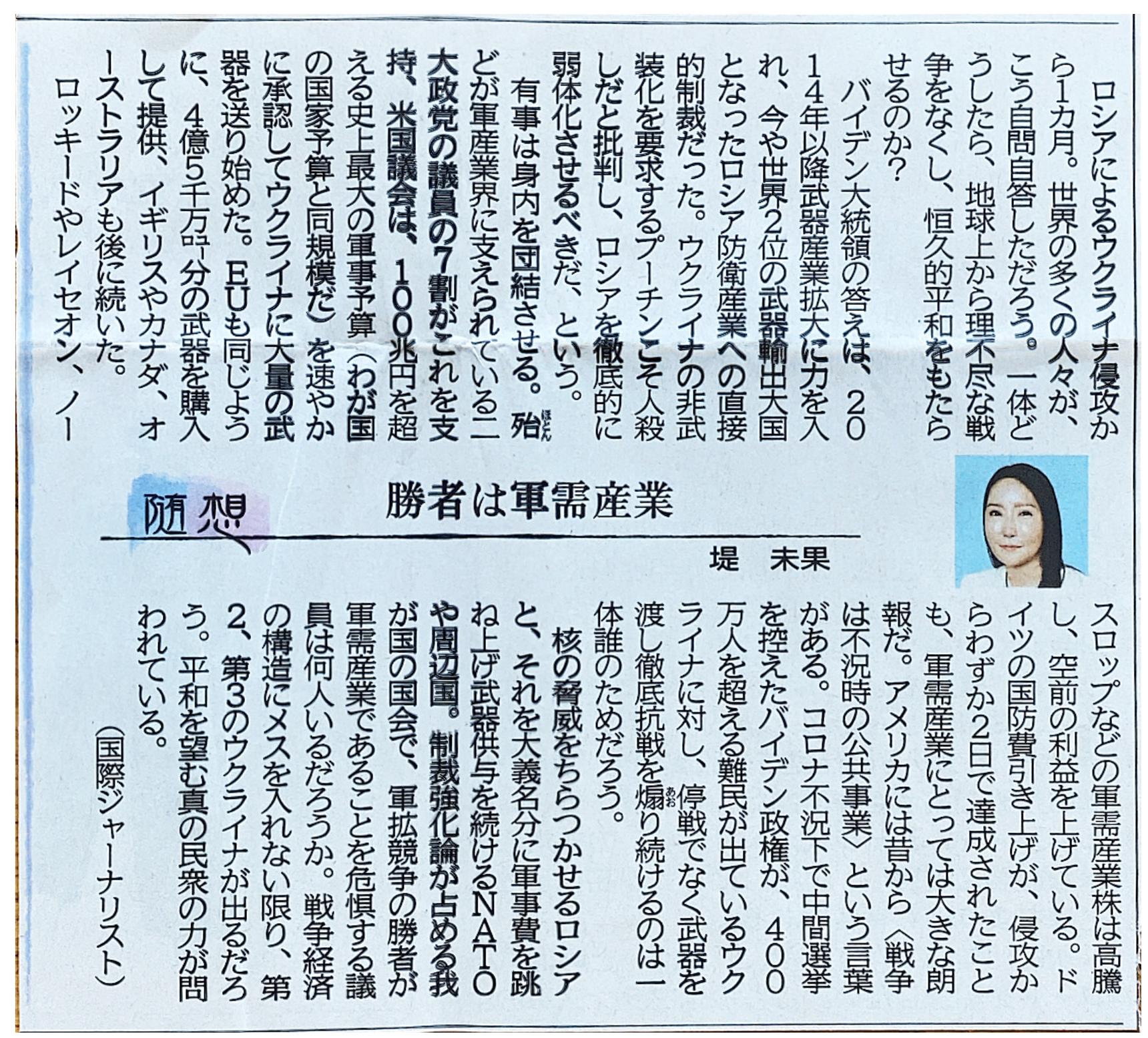 神戸新聞連載「随想」4/5付 勝者は軍事産業