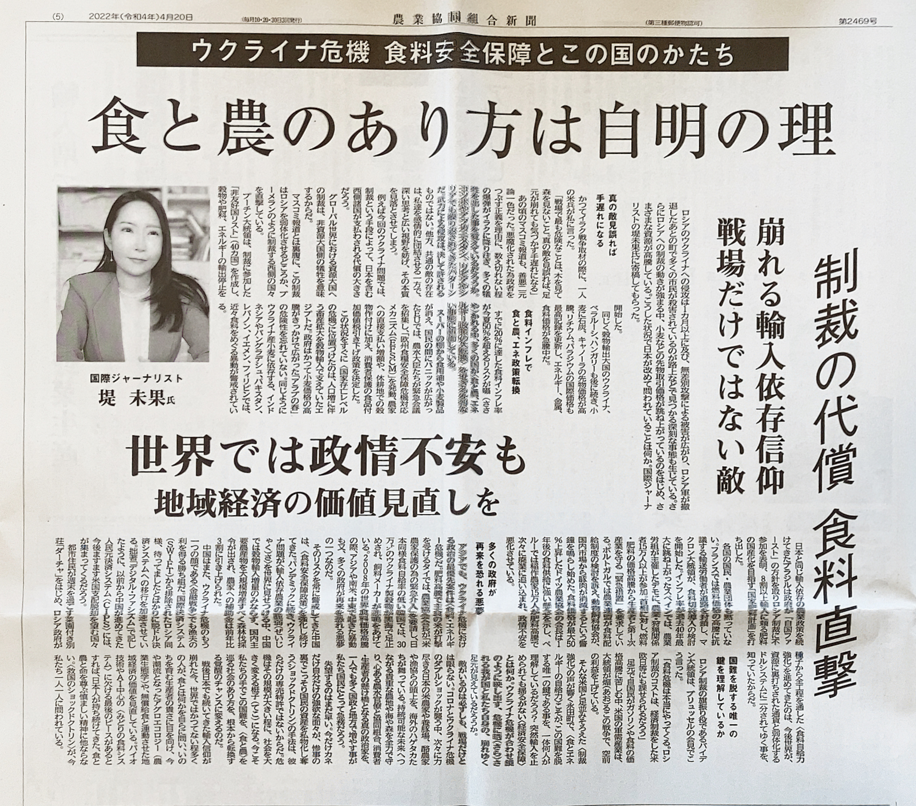「農業協同組合新聞」4/20付にウクライナ危機についての記事を寄稿しました!