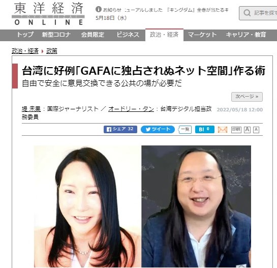 オードリー・タン氏との対談が「東洋経済」オンラインに掲載されました!全