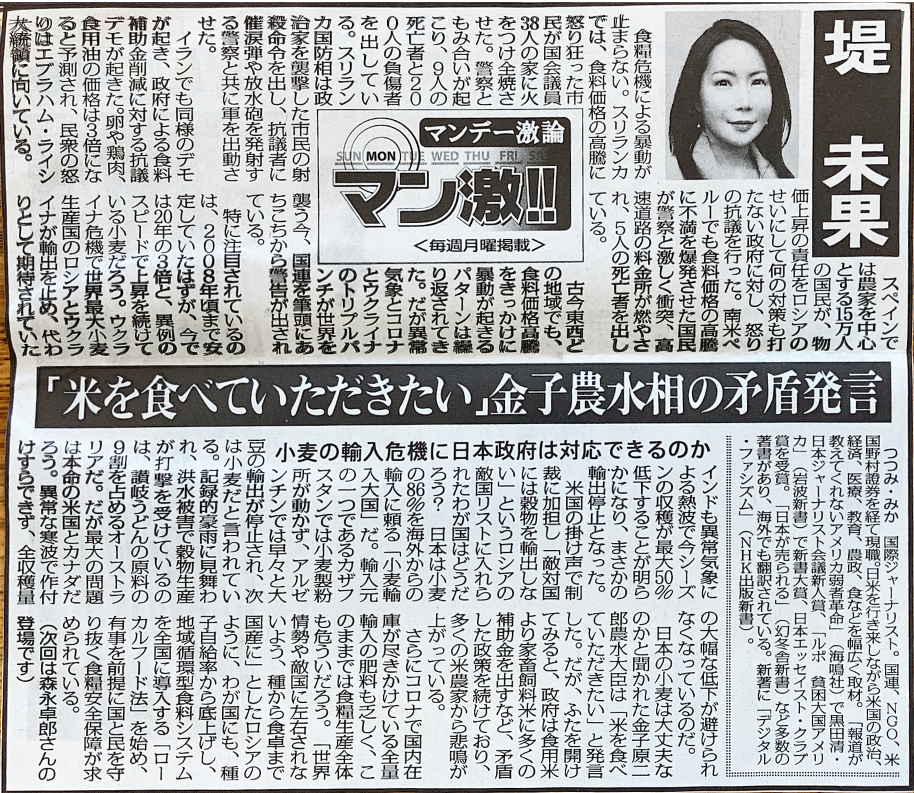 「米を食べていただきたい」金子農水相の矛盾発言:東京スポーツ・マンデー激論 2022/5/24の記事