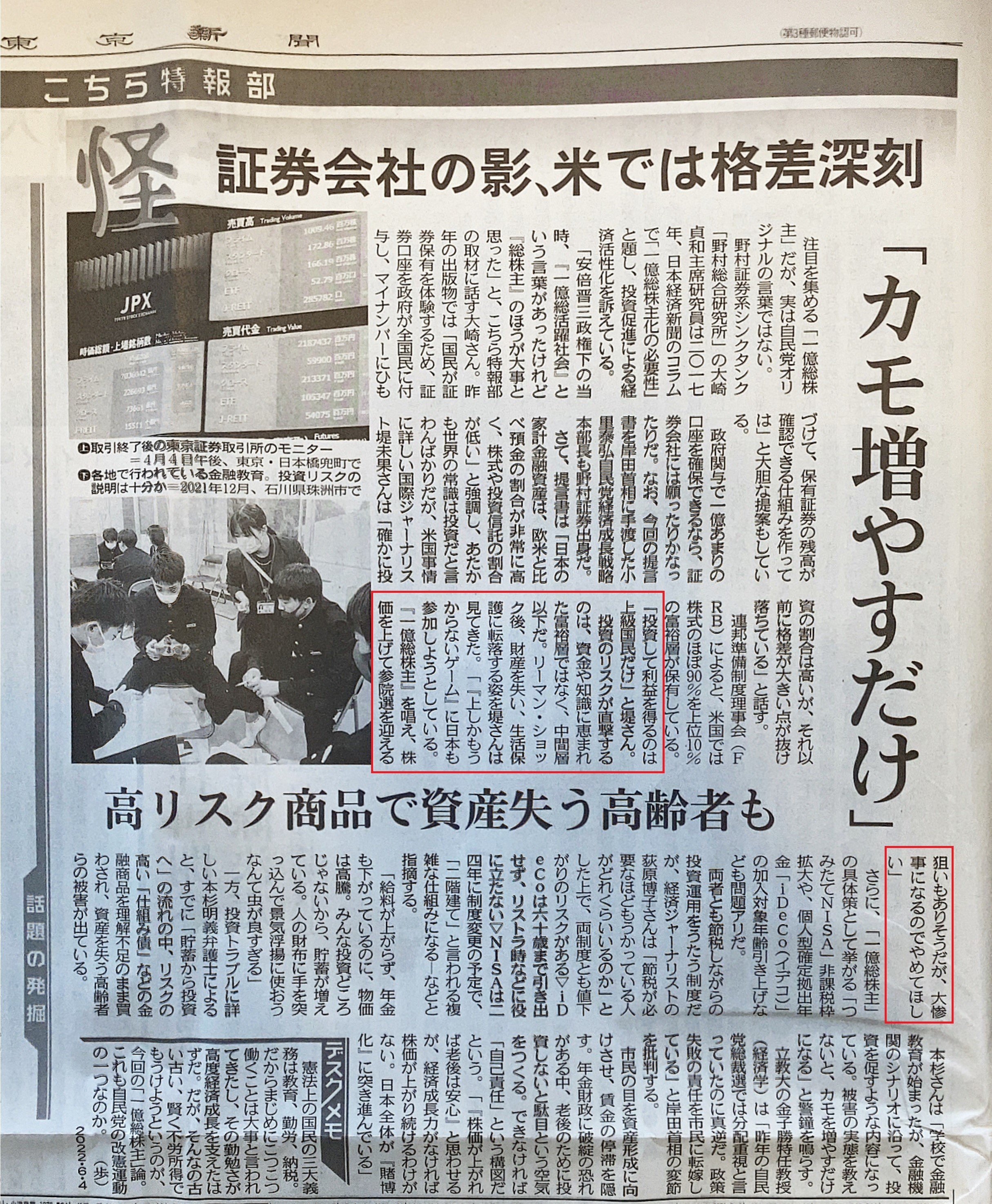 総理の一億総株主発言について、東京新聞にコメントが掲載されました!