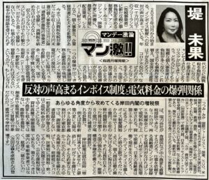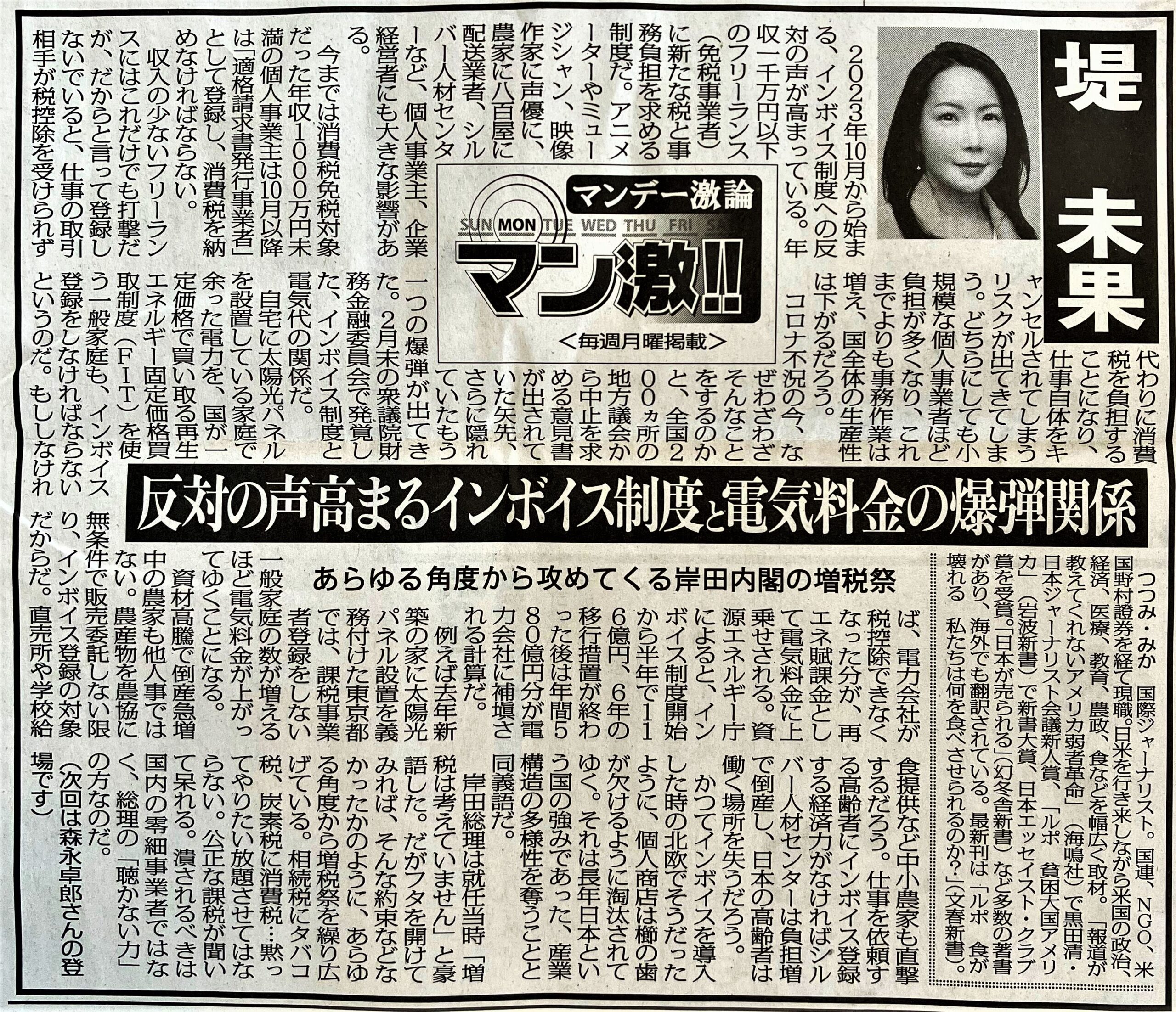 『反対の声高まるインボイス制度と電気料金の爆弾関係』東京スポーツ「マン激」 連載 2023年3月号
